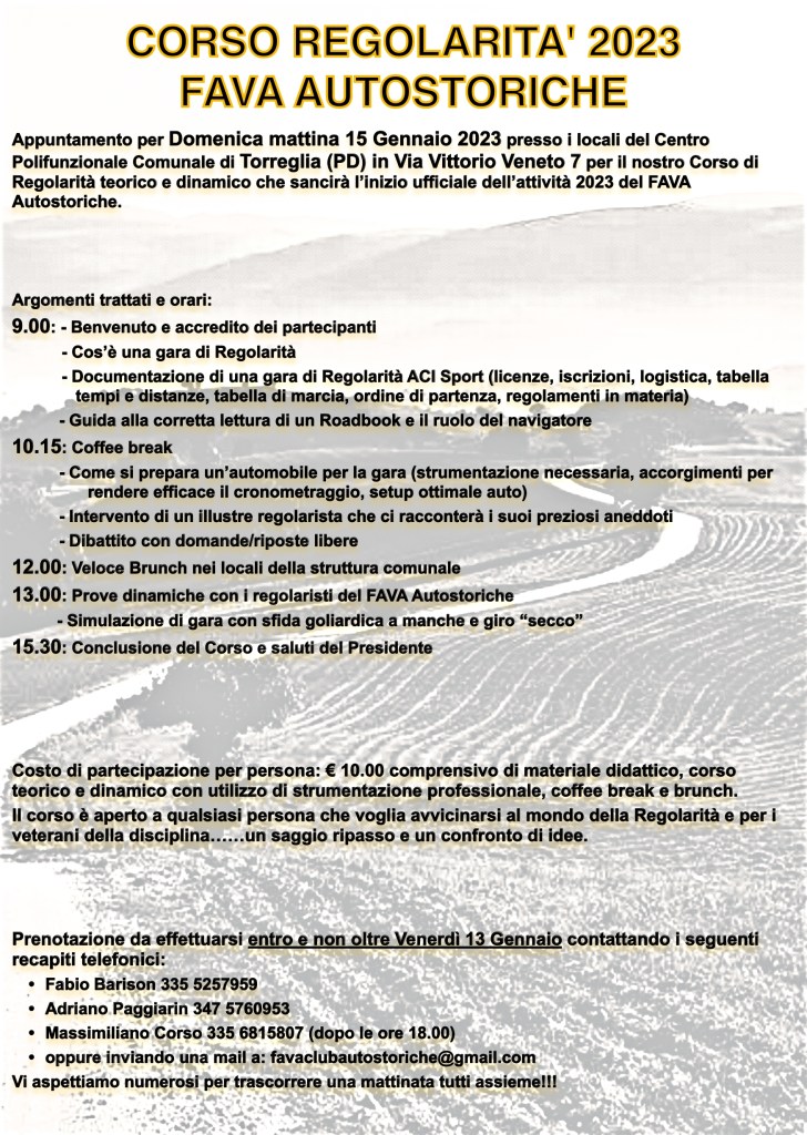 Appuntamento per Domenica mattina 15 Gennaio 2023 presso i locali del Centro Polifunzionale Comunale di Torreglia (PD) in Via Vittorio Veneto 7 per il nostro Corso di Regolarità teorico e dinamico che sancirà l’inizio ufficiale dell’attività 2023 del FAVA Autostoriche.