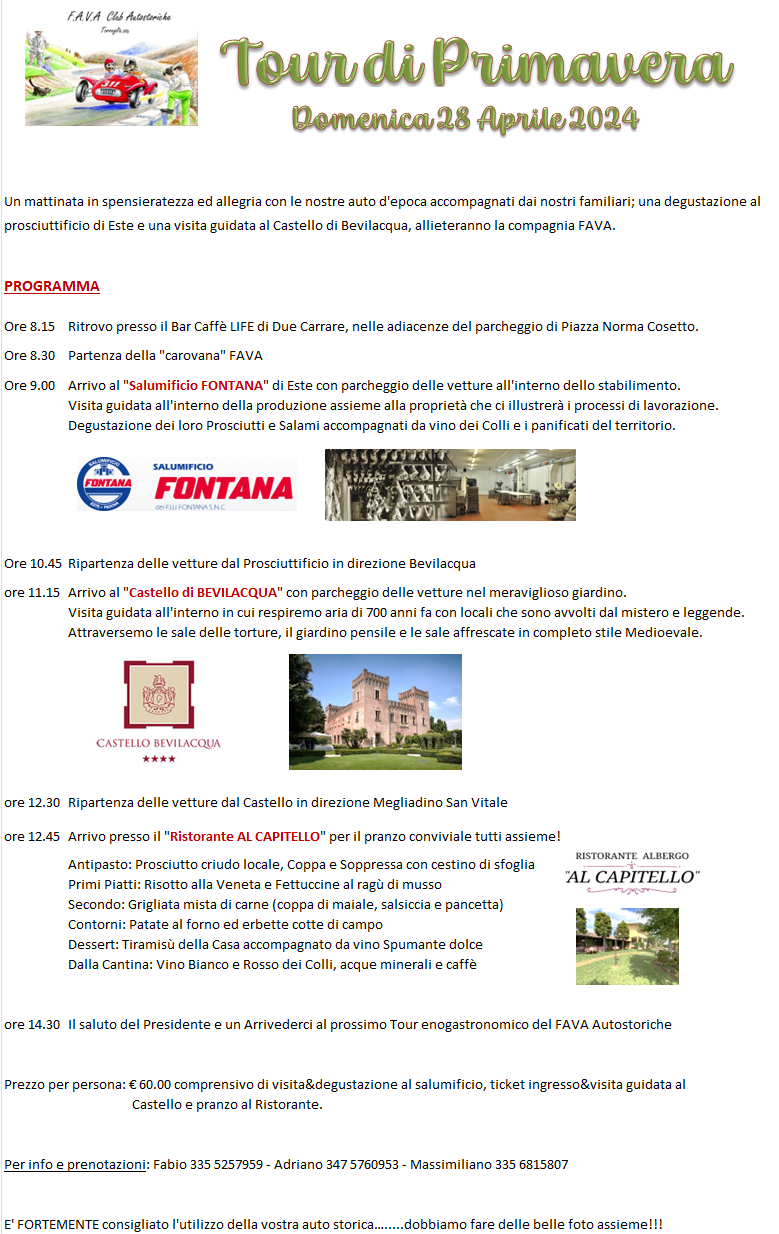 Un mattinata in spensieratezza ed allegria con le nostre auto d’epoca accompagnati dai nostri familiari; una degustazione al salumificio di Este e una visita guidata al Castello di Bevilacqua, allieteranno la compagnia FAVA.